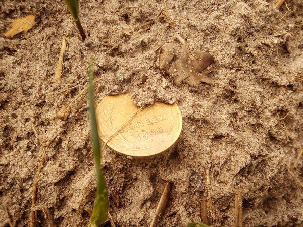 Меня всегда поражает, как на одном месте наслаиваются разные исторические пласты. Прямо за территорией скита в советское время стоял дом лесника. Сейчас же это место распахано и иногда засевается для привлечения дичи. О том, что жизнь здесь кипела и в советский период, красноречиво говорит вот эта монета, просто лежащая на земле.