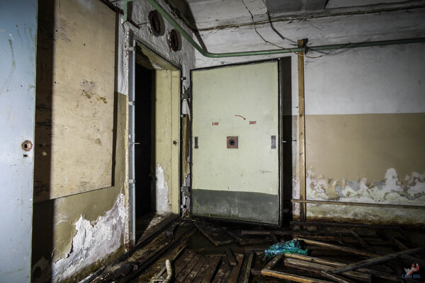 Впереди показалась первая герметичная дверь. Пора было разворачивать технику и начинать съёмку. Напомню: это убежище официально числится на балансе и расположено прямо под работающим банком.