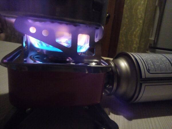 И все — горелка работает! Можно греть воду или разогревать консервы в походных условиях.