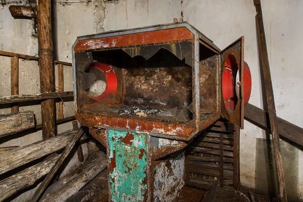 У стены стоит старый лототрон — вероятно, его принесли сюда из парка.