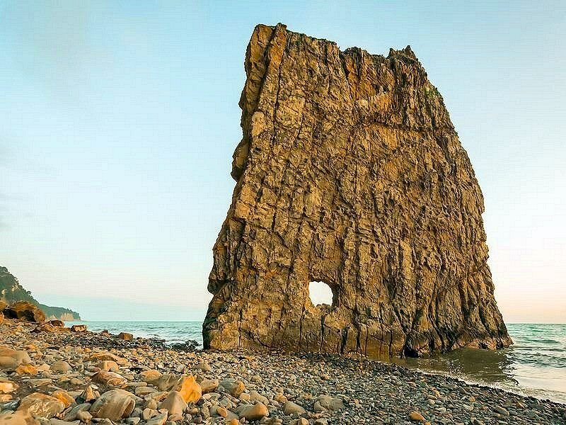 Там, недалеко от берега, находится уникальное творение природы — скала Парус. Это каменная глыба, которую ветер и волны за тысячелетия превратили в подобие корабельного паруса, ставшего символом этих мест.