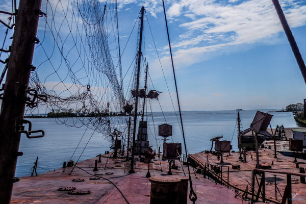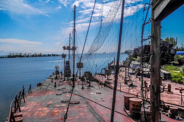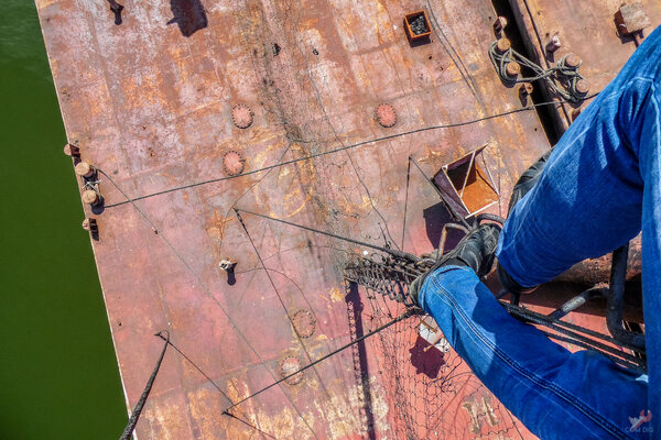Вблизи стало ясно, что подняться на корабль просто так не получится. Корма находилась в нескольких метрах от берега, и глубина у среза воды была явно приличной. Идея измерить её и пройти босиком казалась сомнительной, а плыть с фотоаппаратурой и электроникой в рюкзаке — и вовсе рискованной. Но очень уж хотелось оказаться на палубе! После недолгих раздумий мы обратили внимание на толстый, натянутый трос, которым одно из судов было пришвартовано. Он выглядел надёжно. Проверив его прочность, я решился на подъём. Забраться по тросу оказалось делом несложным, правда, пришлось немного испачкать одежду.