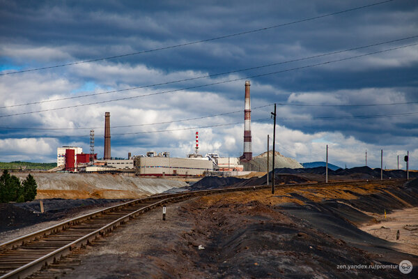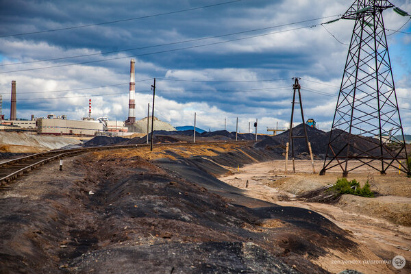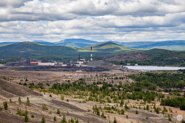 Видны огромные шламовые поля и отвалы, над которыми возвышается металлургический завод.