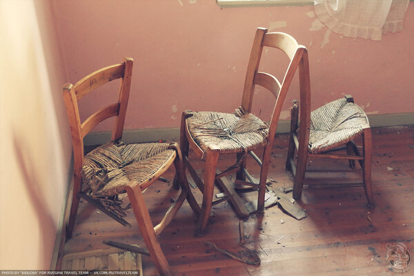 Мебель, скорее всего, была поломана уже после отъезда хозяев. Трудно представить, чтобы кто-то целенаправленно хранил дома три одинаковых сломанных стула.