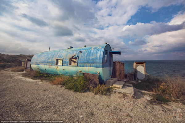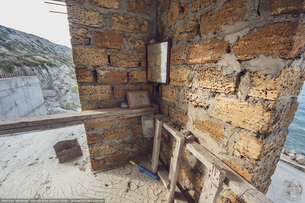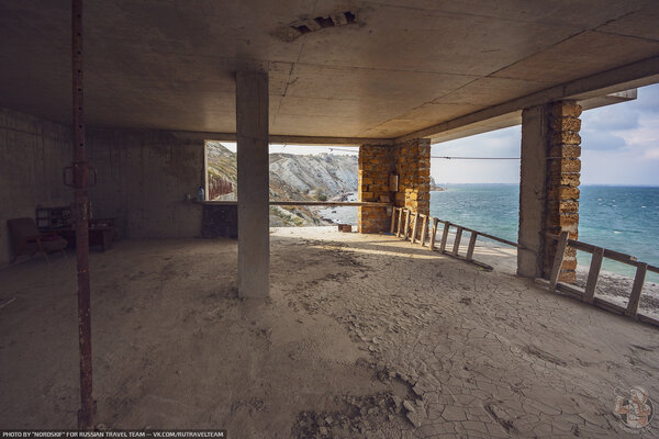 Почему я решил, что это именно заброшенный объект, а не активная стройка? Всё просто: бытовка рабочих стоит с выбитыми и заколоченными фанерой окнами, а туалетная кабинка потихоньку сползает вниз, к морской воде.