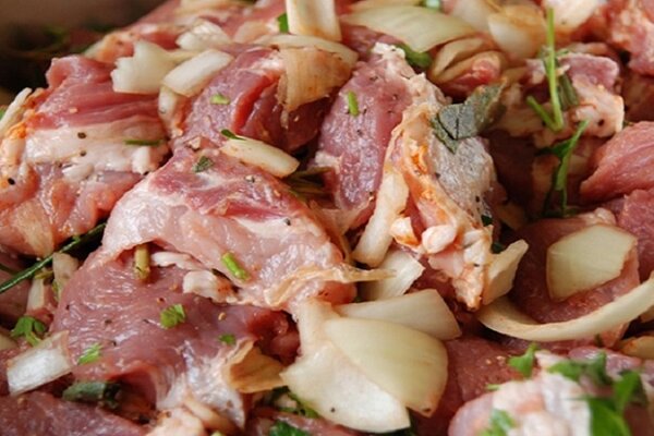 - В глубокую миску для маринования начинайте выкладывать слоями: слой мяса, часть маринада, слой лука полукольцами. Повторяйте последовательность, пока ингредиенты не закончатся. Верхним слоем должен быть лук.