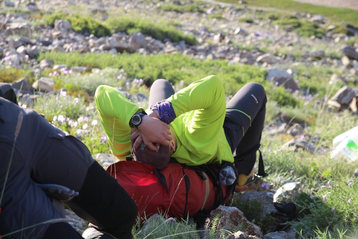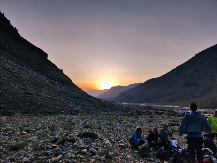 Сладковато-приторный запах на месте стоянки я заметил не сразу, в отличие от мух, которые периодически налетали на нас. В результате разведки выяснилось, что неподалеку лежал… труп горного барана! Катя Б. предположила, что он сорвался со скального склона (мы стояли как раз под скально-травянистым бортом долины), разбился и потихоньку начал разлагаться. Однако сил на перемещение лагеря уже ни у кого не было, поэтому решили просто игнорировать подобное соседство (Комм. Кати Б - “А я потом пошла паковать его в черный мешок”).
