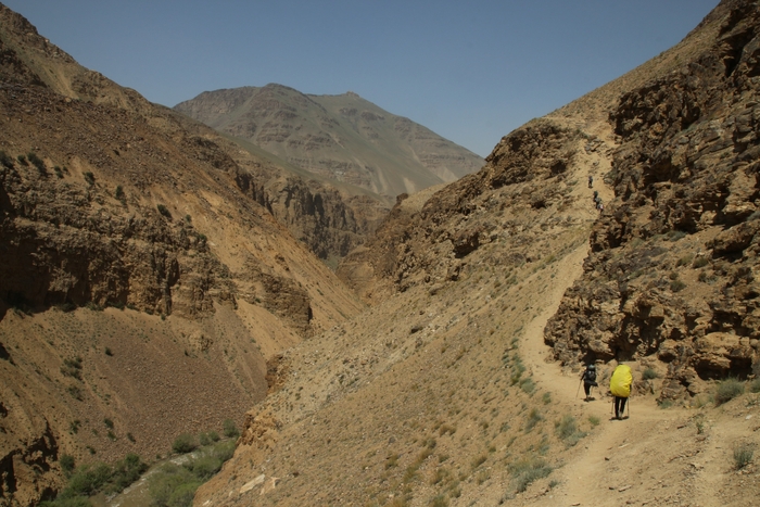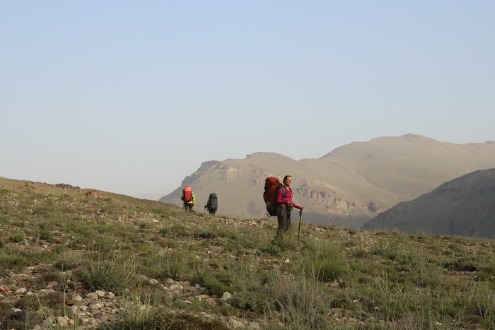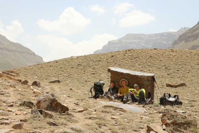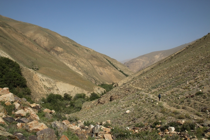 Я обратил на это внимание уже за пару километров до конца маршрута. На участке тропы вдоль прижима тени не было - поэтому делать привал приходилось прямо на тропе, на палящем солнце. Почему-то сильно отставал Дима, внешне казавшийся физически здоровым, однако шедшим медленно. Другие ребята разгружали его (забрали веревку еще до обеда, после - что-то еще - прим.Вани), однако будто это не сильно помогало: любой локальный подъем вверх сразу приводил к тому, что “хвост” отставал минут на 25 при 15 минутах ходьбы.