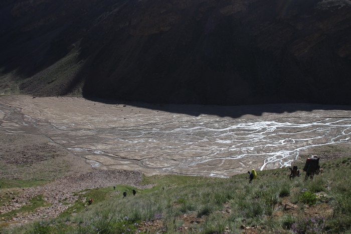 Впрочем, не считая этой помехи, затем ландшафты были отличные: мы вывалились окончательно на зеленые полянки. Дальше сбрасывать нужно было до русла реки Джелонде, а затем - набирать вверх по течению, подбираясь под наш следующий перевал - Андиз.
