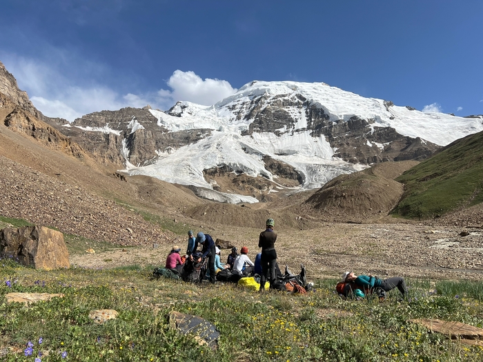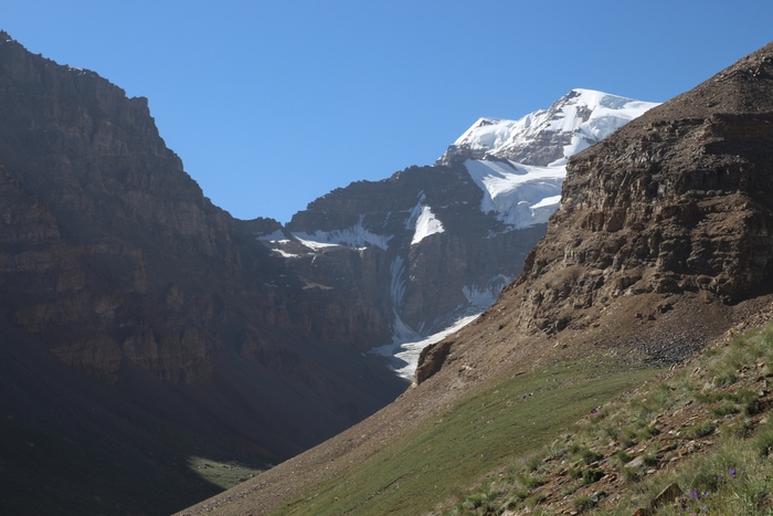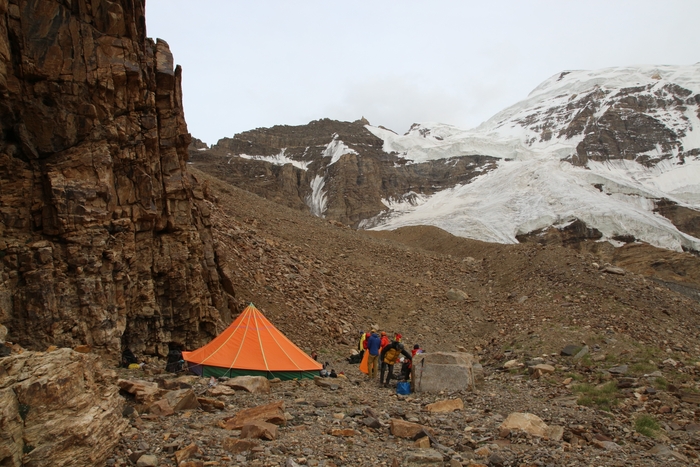 После обеда предстояло забирать еще метров 300-400. Мы привалились на хороших разливах, откуда был виден массив Джентива. Здесь же можно было снова припасть к той памирской красоте, ради которой я и звал ребят в Азию - увидеть россыпь многочисленных цветов на фоне пяти-шеститысячных снегов и льдов. Впрочем, когда мы полезли дальше, то все сменилось прозаичной мореной, пускай и украшенной хорошими выровненными площадками.