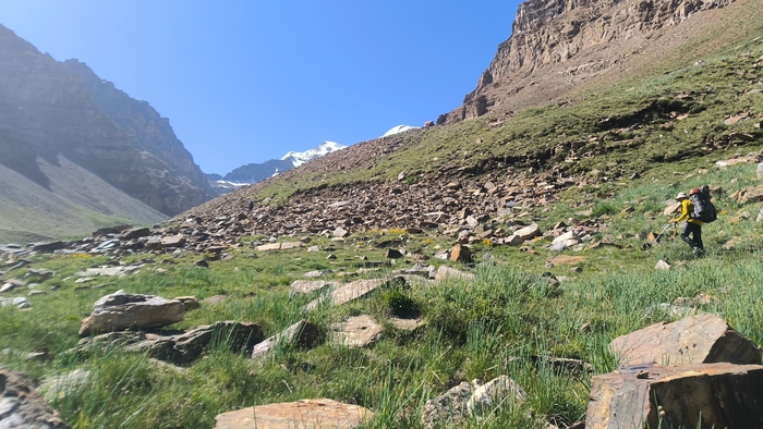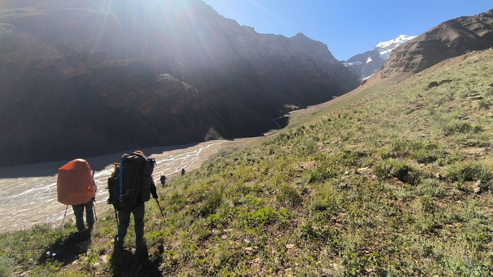 Сразу после места наших стоянок начинались зеленые полки. Вроде какой сезон уже в горах, а какое счастье увидеть траву после ледников. Однако позитив оказался омрачен неприятным конгломератным склоном, метров 70 по высоте и с достаточной крутизной.
