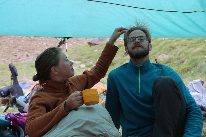 Встали мы под видавшими виды скалами. Боулдеринг хоть и был манящ, но противопоказан - целые пласты горных пород можно было вытащить голыми руками. Поставив шатер (после значительной дискуссии, куда конкретно) на расстоянии нескольких метров, принялись бивачить.