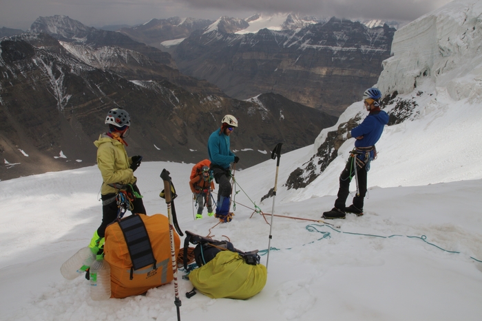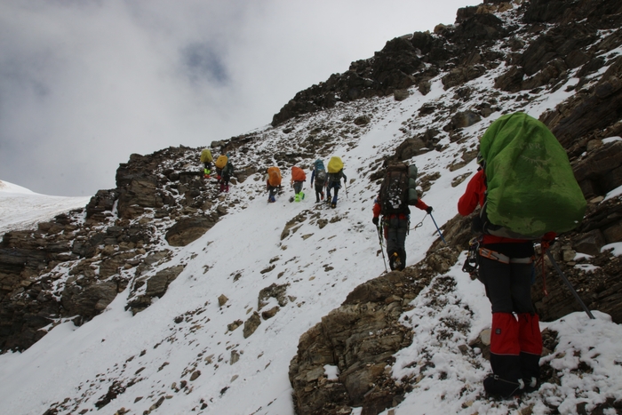 Так или иначе, линзы вставлены, кошки с бахилами надеты, шатер встряхнут (стало чуть легче, но не сильно), связки сделаны. Выдвигаемся на наш следующий перевал, самый высокий на этом кольце - Марко Поло, 5600. Честная 2Б.