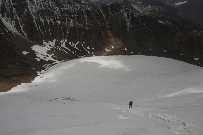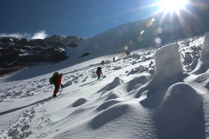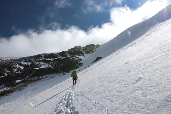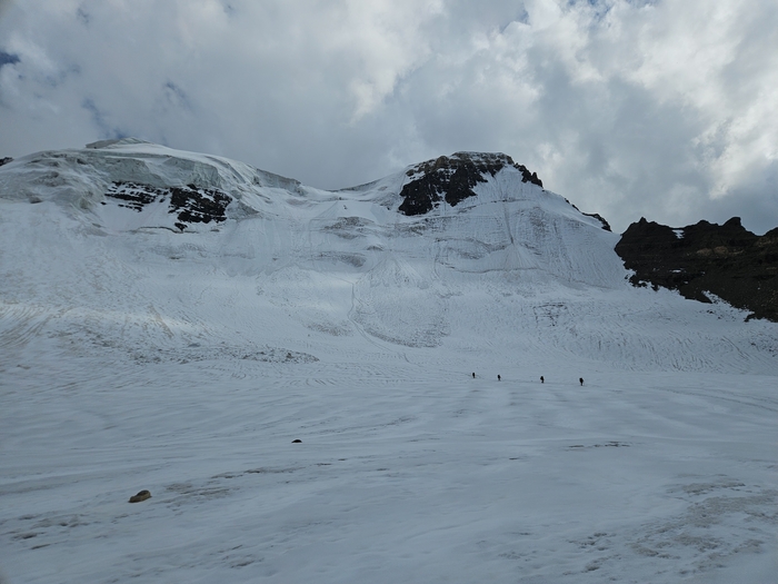 Мой темп намекал, что на перевал я готов лишь ползти. Впрочем, я отправился за двумя Катями и Мишей, но чем ближе был Марко Поло, чем положе был склон, тем больше я понимал, что ноги меня уже толком не слушаются, собственно, как и руки. Напоминало все первый день, когда было тяжело встать под конец ходового дня. Теперь же предплечье предательски ослабло, что даже ледоруб в руке было тяжело зафиксировать.