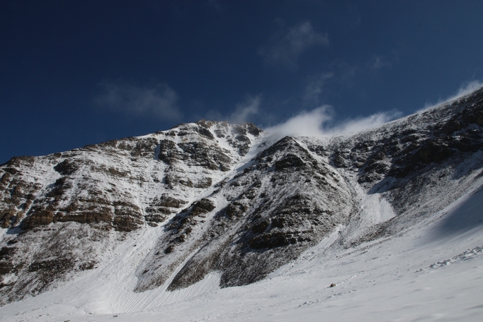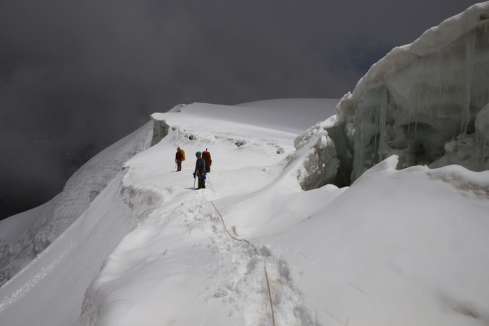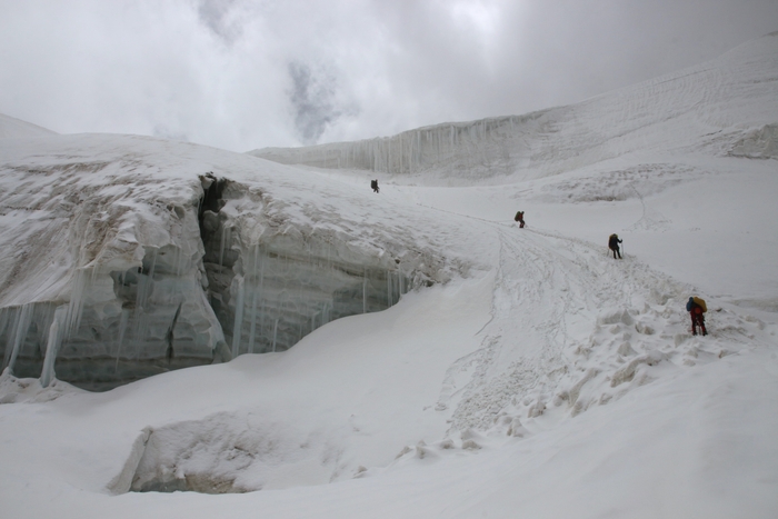 С седловины обогнули достаточно хищно ощерившийся карниз с огромными сосульками. Нечто подобное я видел лишь в разломах на ледопаде между первым и вторым лагерями на пике Ленина. Выйдя на хорошую снежную площадку, увидели крутой снежно-ледовый склон, где требовалось вешать веревки. Со связками пока покончено. Наконец-то техническая работа - будет о чем писать в хронометраже.