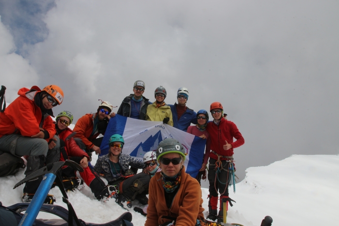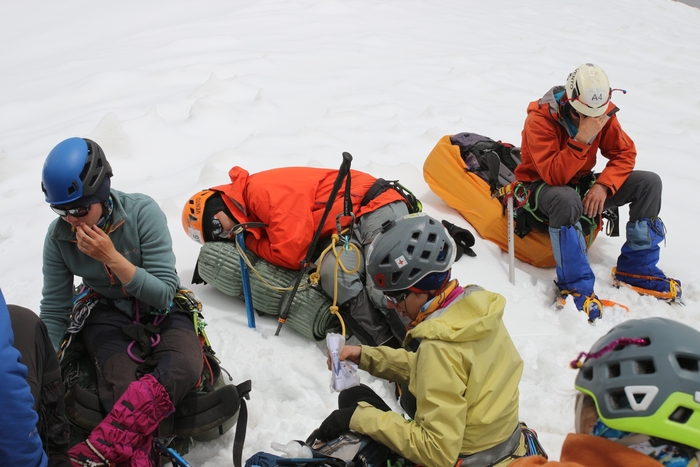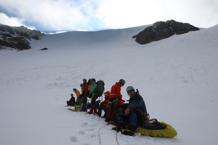 На 5300 еще и затупы начались: сначала предложили нашу связку, где тропила Таня заменить на последующую, где лидировала бы Вероника. Ирония судьбы заключается в том, что Таня потеряла одну из верхонок прямо на склоне, та покатилась вниз, а Вероника, вполне по-голкиперски, остановила движение снаряги. Правда, наш технический фотограф запыхалась за время этого маневра и замена связки повисла. Таня в это время передохнула и готова была тропить дальше.