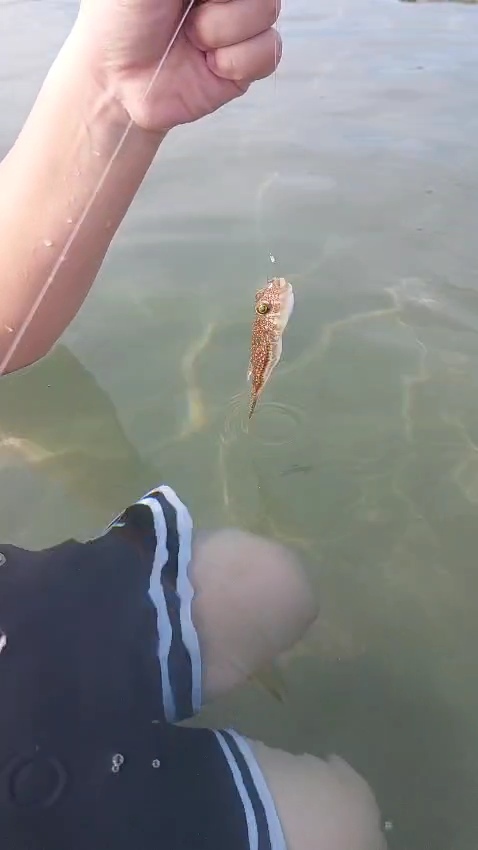Снимать с крючка сыну было неудобно и он позвал на помощь меня. Обхватив привычно рыбу ладонью я заметила, что она начала немного надуваться и у нее как будто маленькие иголочки на пузике появляются. Тогда я посмеялась, что эта рыба фугу, т.к. и предположить не могла встретить её у побережья популярного курорта!