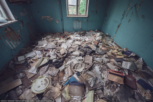 Крыша пока держится, окна в большинстве помещений целы, поэтому бумажные материалы сохранились относительно хорошо.