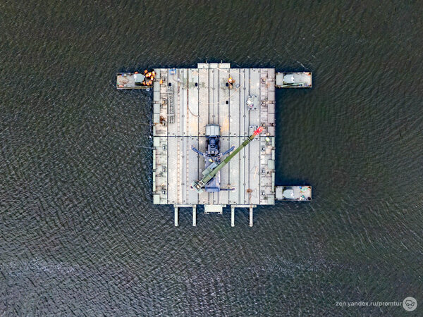 И работа закипела. На понтонную платформу установили кран, а буксиры занялись его точным позиционированием на воде.
