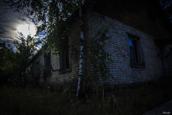 Этим летом нам удалось запечатлеть одно из последних уцелевших зданий посёлка Лесной при призрачном свете луны.