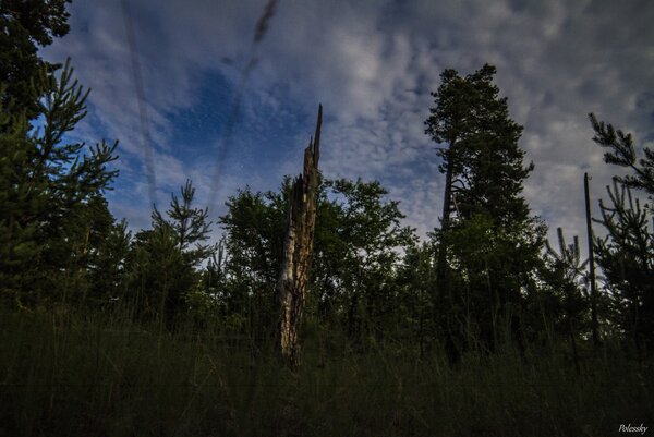 Следующий кадр был сделан ночью. Магическая и одновременно пугающая картина: призрачные силуэты радиоактивных деревьев, а в тишине — лишь навязчивый писк дозиметра, который лишь усиливает гнетущую атмосферу.