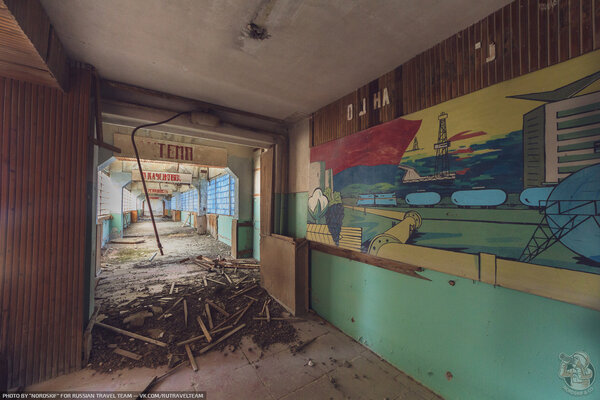 Самым впечатляющим местом на территории оказался переход, соединяющий административный корпус с производственными цехами. Он начинается с настенного стенда, прославляющего успехи нефтяной промышленности, а далее идёт галерея, стены которой сложены из стеклоблоков, создающих особенное освещение.