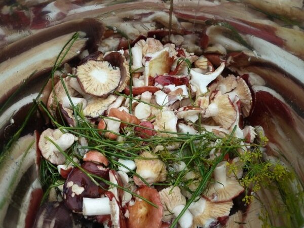 - Подготовленные грибы сложите в чистую ёмкость — подойдёт эмалированная кастрюля, стеклянная банка или просторный таз.
