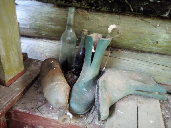 Открываю дверь, и меня встречают старые сапоги и пустая бутылка. На сапогах видны характерные разрезы — признак того, что их носил пожилой человек. С возрастом ноги часто отекают, и чтобы обувь не жала, её вот так подрезают.