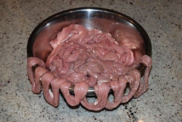 Кишку нужно вывернуть наизнанку, для чего внутрь продевается крепкая бечёвка. В нескольких местах кишку перевязывают нитками.