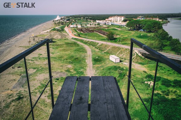 На черноморском побережье есть одно удивительное место, которое сразу приковывает взгляд. Сорокаметровая конструкция, напоминающая гигантскую стопку разноразмерных чипсов, нанизанных на десяток спиц, одиноко возвышается у воды.