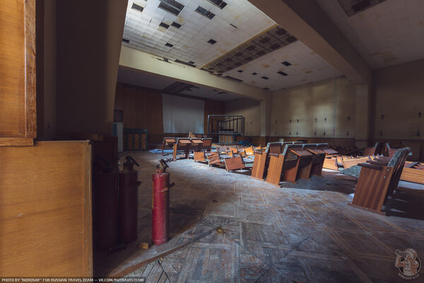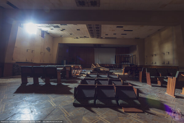 Большинство других комнат оказались совершенно пустыми, и главный интерес представлял собой актовый зал — сердце любого Дворца культуры. Картина была классической для заброшки: часть стульев опрокинута, кое-где обвалился подвесной потолок, но несколько рядов кресел всё ещё стояли ровно, а экран для проектора, к удивлению, даже не был порван.
