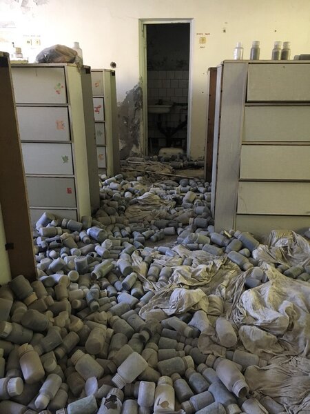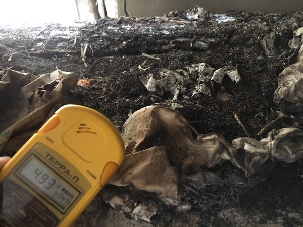 На представленном ниже снимке зафиксированы показания радиации от образцов грунта, которые когда-то изучались в этой лаборатории. Даже спустя 33 года после катастрофы фон здесь составляет 493 мкР/час, что в 16 раз превышает допустимую норму. Это наглядно показывает, с какими опасными материалами приходилось работать учёным.