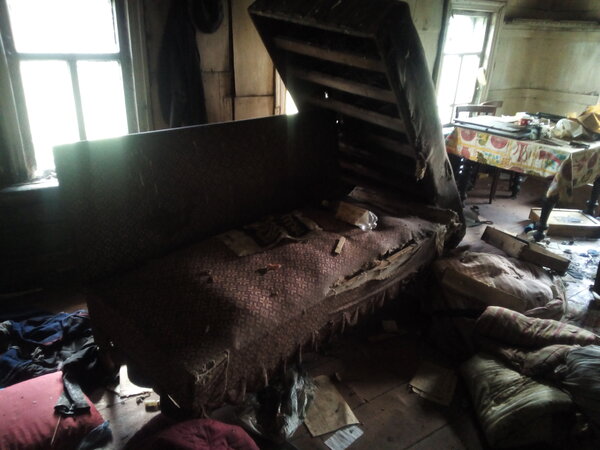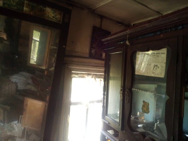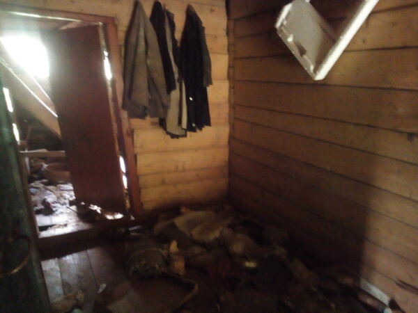 Этот дом сохранился получше. В сенях (или, как говорят в этих краях, «на мосту») еще держится пол. На стене висит какая-то старая одежда и внушительный кусок пенопласта — вероятно, его оставили «про запас» после распаковки новой техники. В деревнях так часто делают: ничего не выбрасывают, вдруг пригодится.
