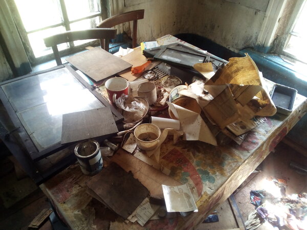 На столе застыла целая эпоха: старые фотографии, пустые рамки от больших черно-белых снимков, рассыпанные таблетки, немытые стаканы, пожелтевшая газета. Время здесь будто остановилось.