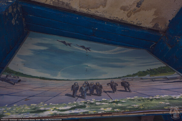 Над входом сохранилась довольно искусная иллюстрация, на которой, что любопытно, изображены лётчики, а не солдаты ПВО. Впрочем, сейчас это уже не имеет никакого значения.