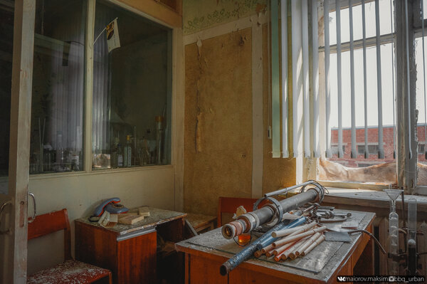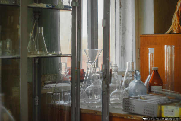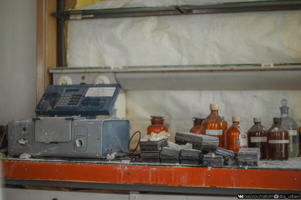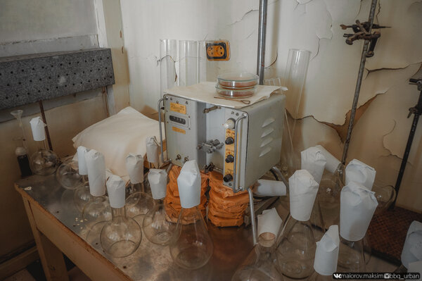 Внутри стоят приборы, а на полках — стеклянные колбы, заботливо прикрытые от пыли листами бумаги, словно сотрудники просто ненадолго вышли.