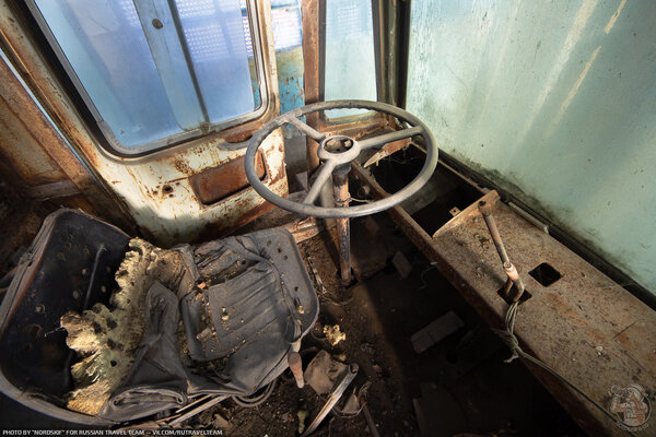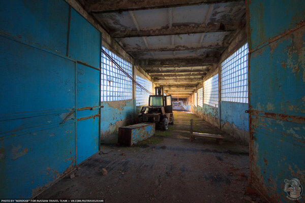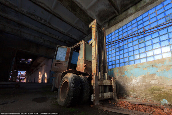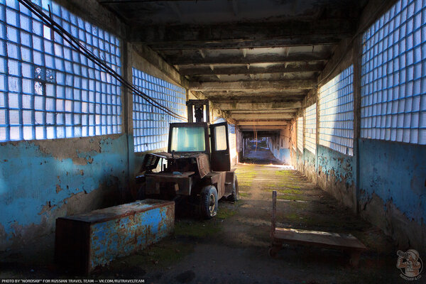 И прямо посреди этого коридора навечно застыл ржавый погрузчик. Его шины спущены, двигатель снят — он больше никогда никуда не поедет.