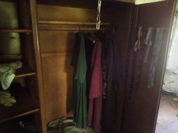 Но стоило лишь повернуть голову, как в сознании чётко возникла мысль: отсюда, кажется, просто бежали. В платяном шкафу так и остались висеть платья — почему-то хозяйка не сочла нужным забрать их с собой. Когда-то она надевала их на праздники, выходила в них на улицы хутора, а теперь они безмолвно «украшают» это заброшенное жилище.