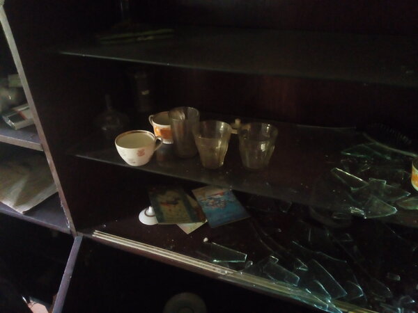 Рядом стоит посудный шкаф. На полках до сих пор стоят чашки, лежат осколки стекла — всё, что осталось от целых стёкол, когда-то закрывавших эти полки.