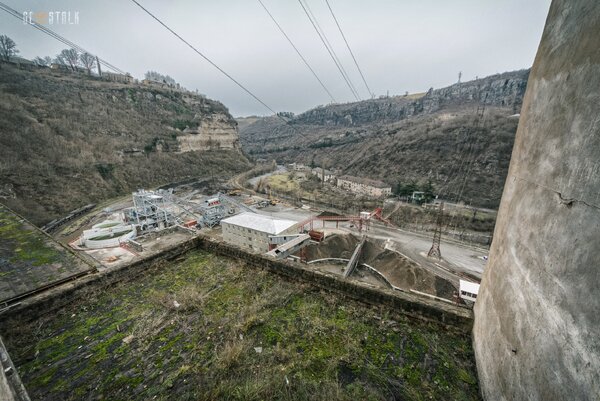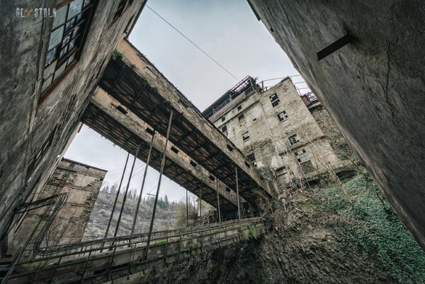 Такое место обнаружилось почти сразу, на подъезде к небольшому горному городку Чиатура. Наше внимание приковал полузаброшенный завод, часть конструкций которого буквально врезалась в склон горы...