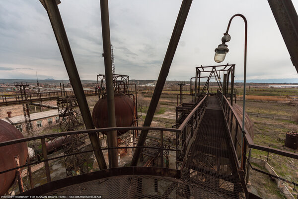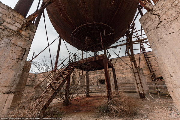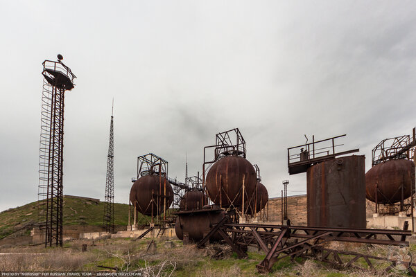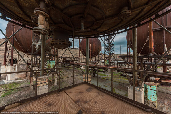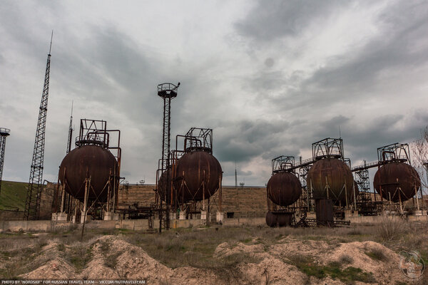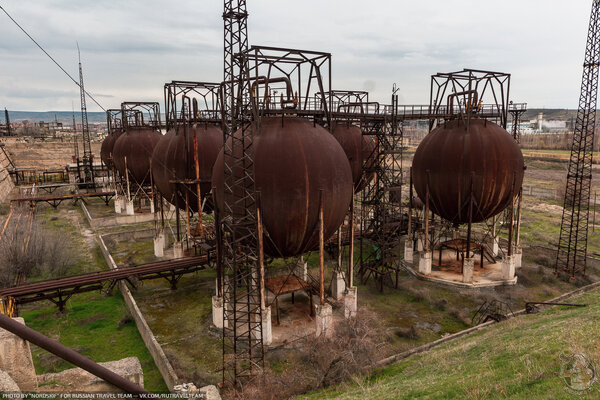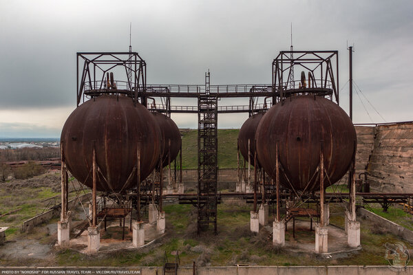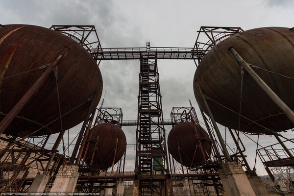 Первое, что мы увидели, подойдя поближе, — это огромные ржавые газгольдеры, похожие на металлические шары. Они сразу привлекли наше внимание.