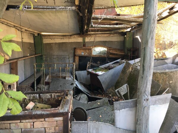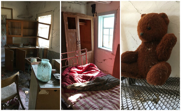 Заглянув в один из первых домов, мы были поражены. Практически всё внутреннее убранство осталось на своих местах. Конечно, мародёры побывали и здесь, но забрали лишь самое ценное. В комнатах до сих пор стоят кровати, шкафы, лежат постельные принадлежности, и даже плюшевый мишка одиноко сидит на полке.