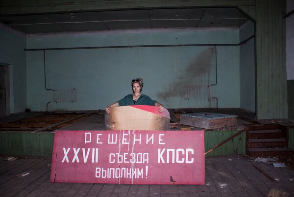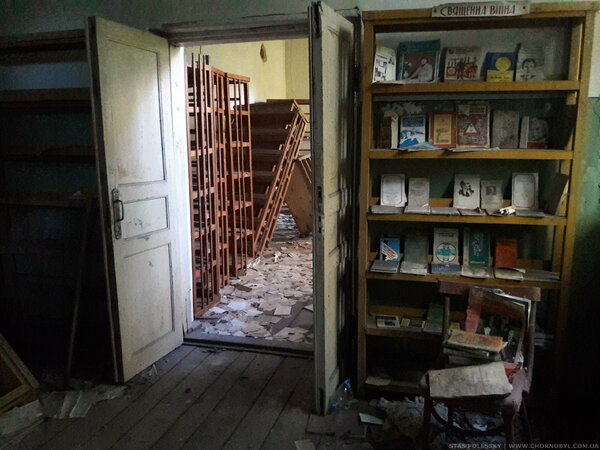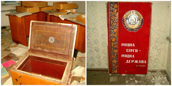 Дальше по пути мы наткнулись на небольшое здание, оказавшееся местным сельсоветом. Внутри — обилие советской символики, сохранившейся так хорошо, будто её использовали на партийном собрании только вчера. В соседней комнате валялся взломанный сейф. Мародёры добрались и сюда, но, скорее всего, все деньги и документы были изъяты милицией ещё в 1986 году, через месяц после эвакуации, когда надежды на возвращение уже не осталось.