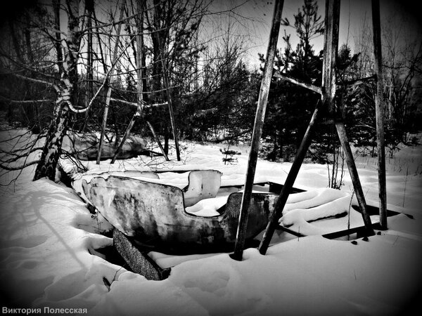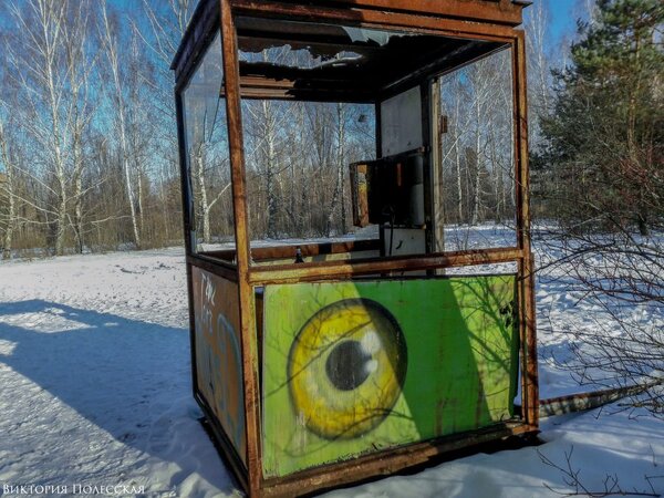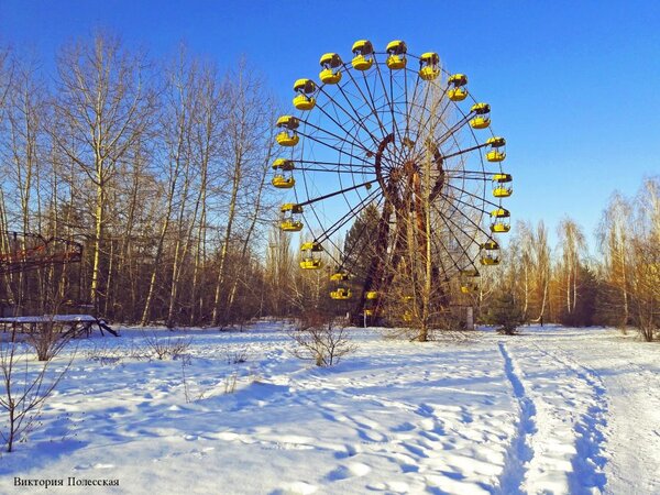 А вот так это же колесо выглядело во время моего визита в феврале 2018 года. Уровень радиации в этом месте пугает: показатели колеблются от 80 до 1000 мкР/час, что превышает естественный фон в сотни раз. От старожилов-ликвидаторов я слышал истории о том, что во время активной фазы работ по устранению последствий аварии на площадке парка садились военные вертолёты.