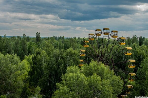 А на этой фотографии — колесо всего через несколько лет после катастрофы. Контраст поражает: спустя 31 год на этом месте выросли высокие деревья, которые теперь тесно обступили конструкцию.