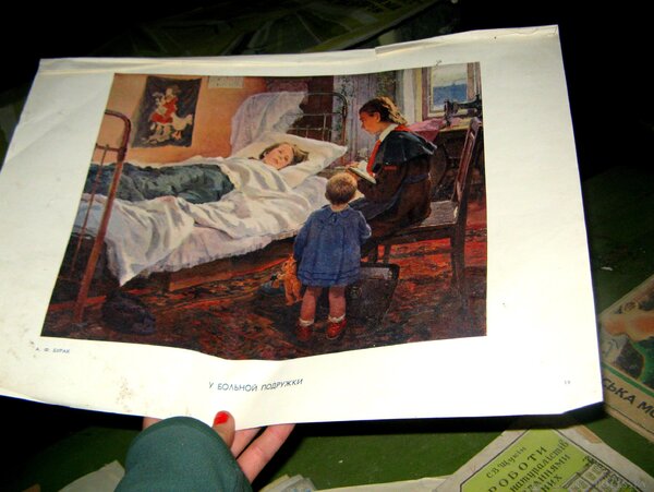 Среди находок — иллюстрация под названием «У больной подружки». На ней изображена девочка-пионерка, которая пришла навестить заболевшую подругу, что очень характерно для воспитательных материалов того времени: