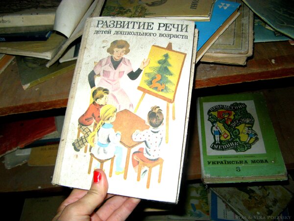А это — учебное пособие «Развитие речи», вероятно, предназначенное для воспитателей детских садов и учителей младших классов. Что касается безопасности, то книги здесь не представляют радиационной угрозы, их можно спокойно брать в руки и даже листать. Однако выносить что-либо за пределы зоны отчуждения строжайше запрещено.