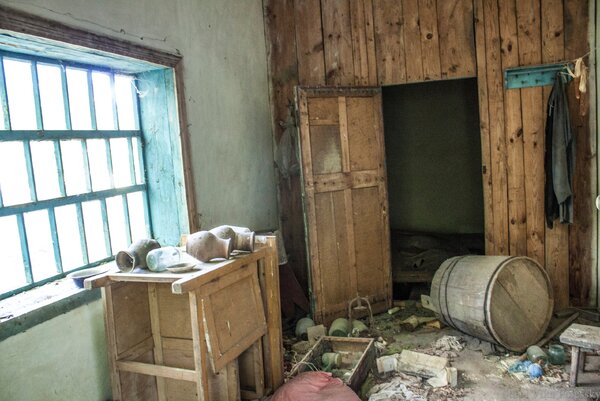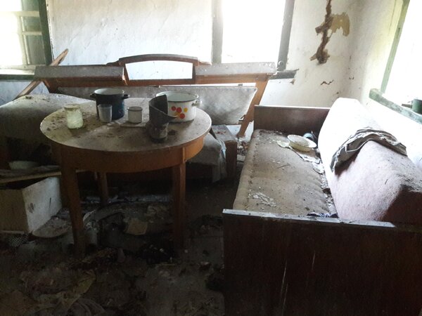 А в этом доме время застыло прямо во время обеда. На месте стоят диваны, кастрюли, банка из-под молока и кружки.
