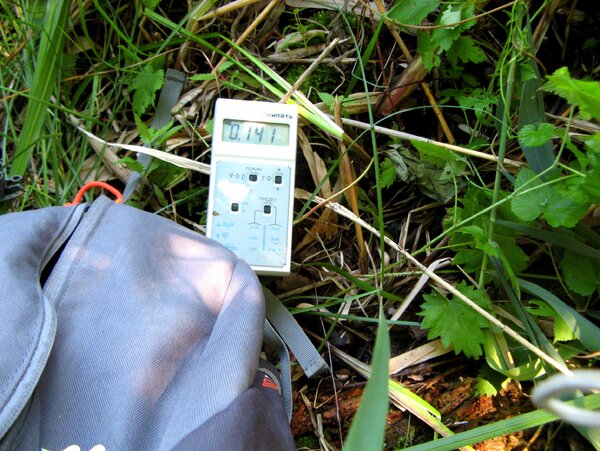 Еще один замер радиации, на этот раз у пруда на окраине села. Показатели снова превышены — в 4-5 раз по сравнению с нормой.