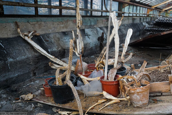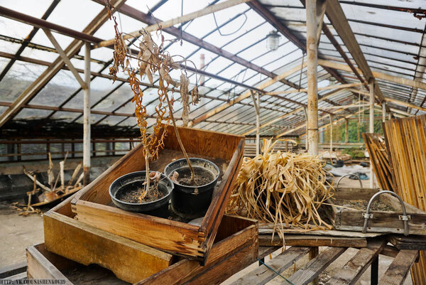 По всем теплицам разбросаны горшки с погибшими растениями — немые свидетели былых экспериментов.